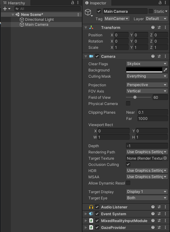 카메라는 Scene에 만들어진 물체들을 어떻게 보여줄 지를 나타내는 component입니다. Scene이라는 영화세트장에 Camera를 들고 다니는 형태를 생각하시면 됩니다. 각 속성 값들은 초기에 Unity를 이해하는데 방해가 될 같아 차후에 다른 포스팅으로 다루겠습니다.